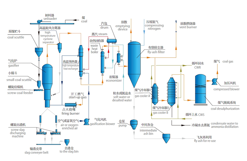 原煤經(jīng)過破碎后通過皮帶輸送至原煤貯斗,由螺旋給煤機送入氣化爐,與來自高溫預熱器的高溫空氣(或富氧氣化劑)、蒸汽發(fā)生氣化反應,所產(chǎn)生的爐渣通過皮帶輸送至渣倉;氣化所產(chǎn)生的粗煤氣夾帶飛灰進入高溫旋風分離器,大顆粒飛灰被分離后返回爐膛繼續(xù)反應,小顆粒飛灰與煤氣在高溫預熱器內(nèi)與來自氣化風機的空氣(或富氧氣化劑)、汽包的蒸汽進行熱交換,產(chǎn)生高溫氣化劑;出高溫預熱器的煤氣再進入余熱回收器、省煤器與水進行熱交換,產(chǎn)生飽和蒸汽;出省煤器的煤氣進入布袋除塵器,在此小顆粒飛灰被過濾并送入氣力輸送系統(tǒng),所產(chǎn)生的潔凈煤氣進入煤氣冷卻器,降溫后進入煤氣脫硫系統(tǒng)脫除硫化氫,經(jīng)煤氣加壓系統(tǒng)加壓后送入用戶(煤氣脫硫及煤氣加壓系統(tǒng)可根據(jù)后續(xù)工藝選擇性建設(shè))。